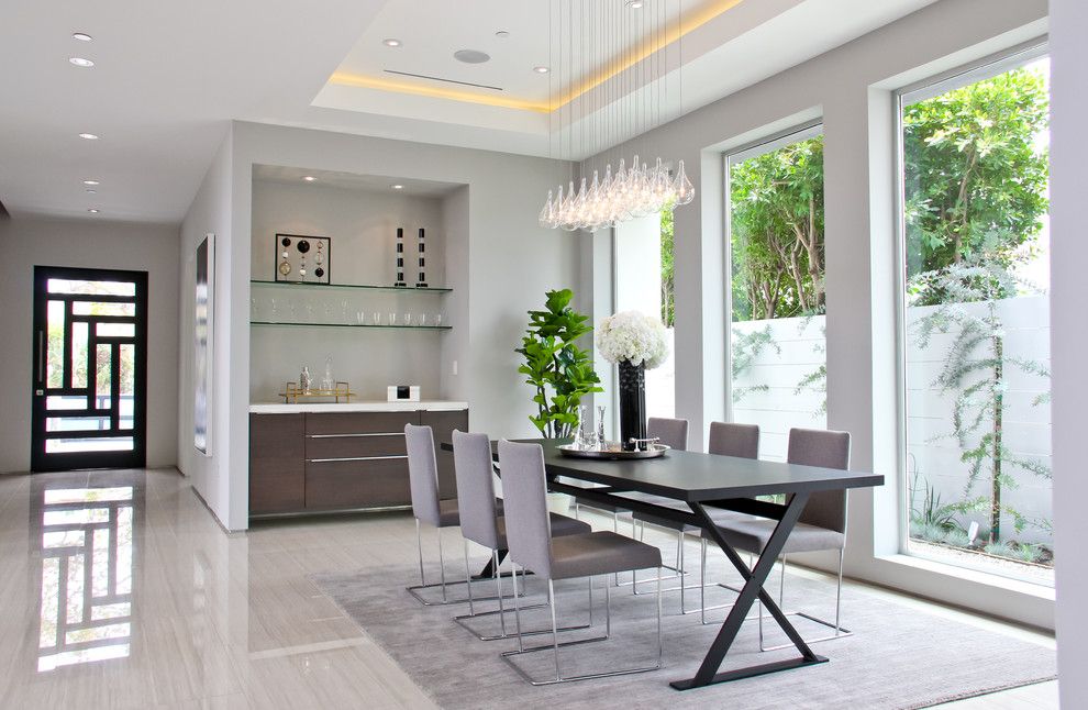 Woodgrain Doors for a Contemporary Dining Room with a Pendant Lighting and Alfred by Boswell Construction